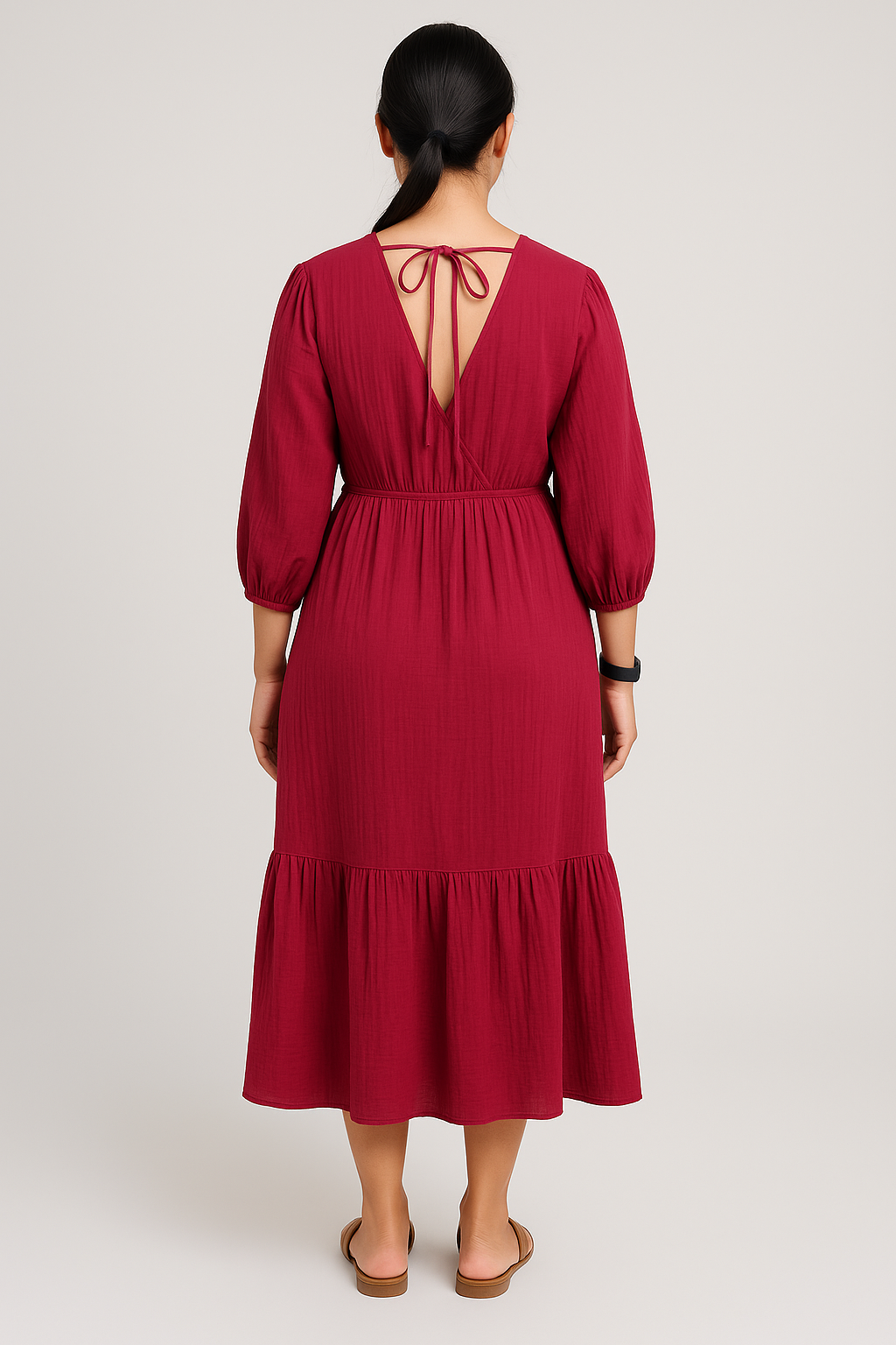 This maroon midi dress blends elegance and comfort with its modern yet timeless design. The deep V-neckline elongates the neckline, while the cinched waistline defines the figure without compromising on ease. Its three-quarter bishop sleeves add a touch of softness, perfectly balanced by the tiered ruffle hem that creates graceful movement with every step. The 100% Cotton Premium Double Gauze fabric not only enhances the aesthetic but also provides a breathable, lightweight feel, making it an ideal choice for all-day wear.