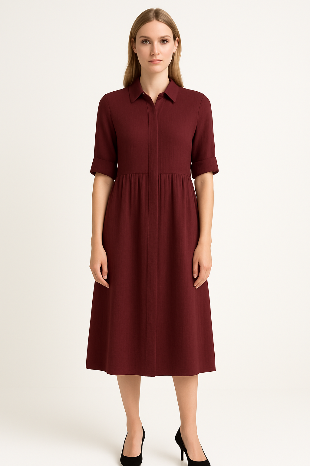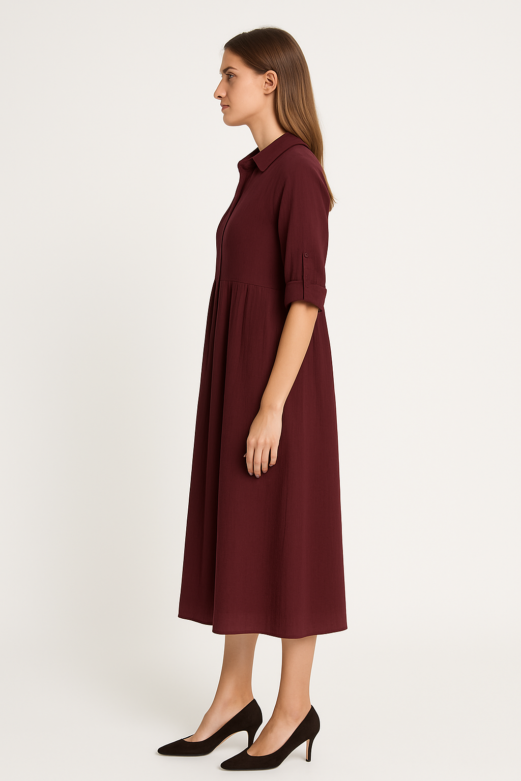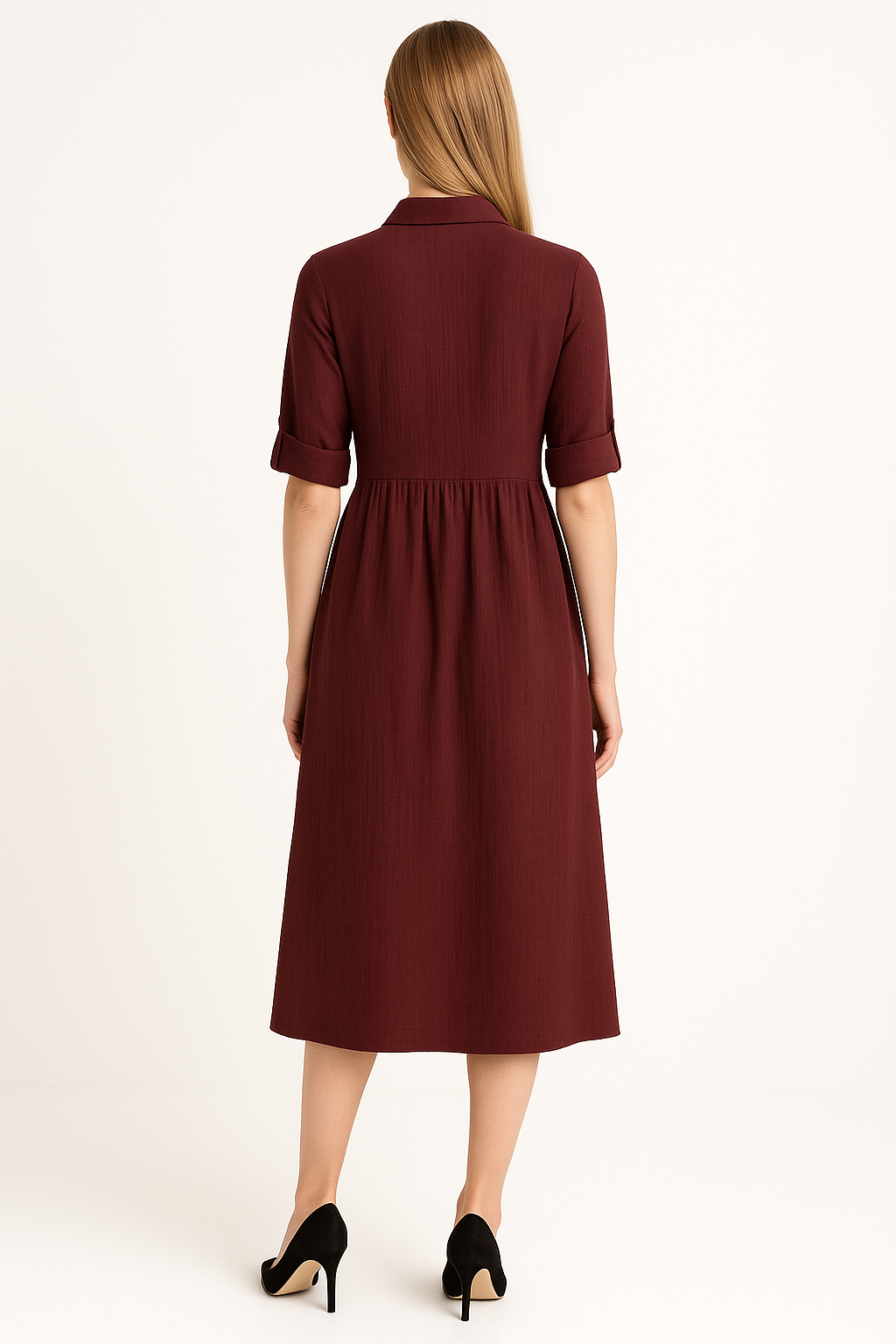 Step into quiet luxury with our Wine-Brown Midi Shirt Dress, designed for the woman who moves with effortless confidence. Its cotton double gauze fabric drapes gracefully, while the hidden placket and shirt collar lend refined simplicity.