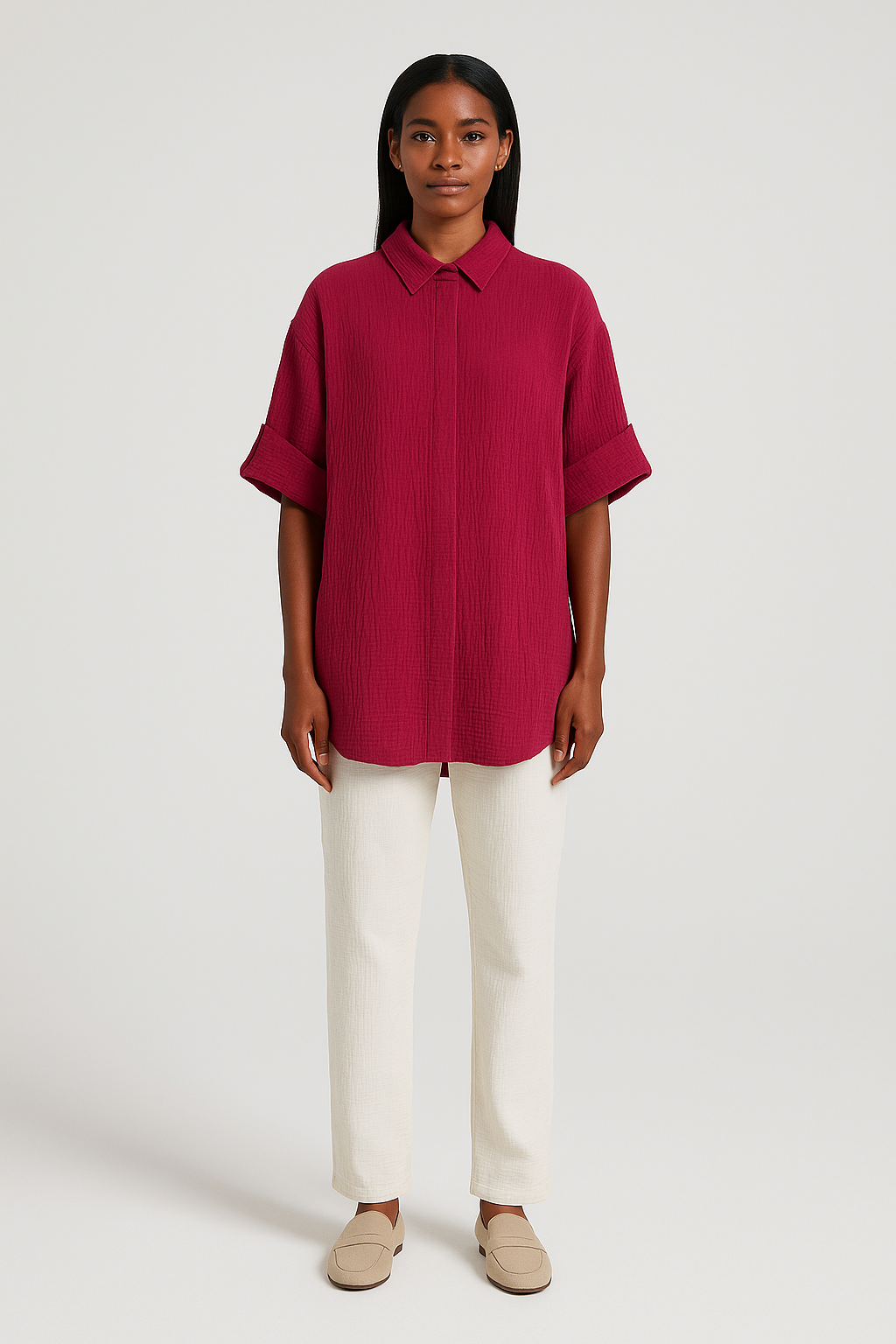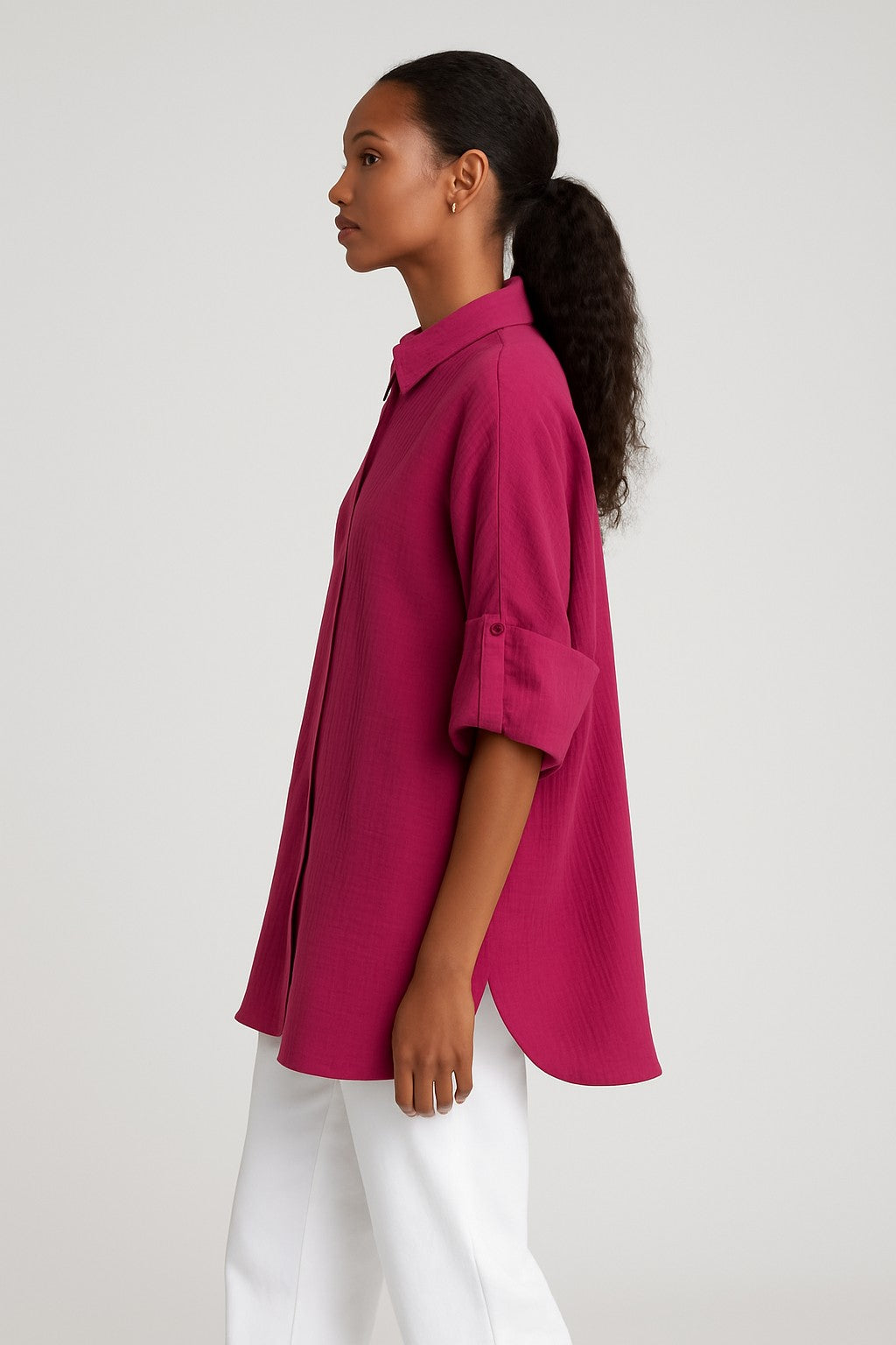 The crinkled textured fabric adds subtle sophistication, while the pointed collar and rolled-up sleeves balance relaxed comfort with premium style. Perfect for styling with tailored trousers, skirts, or denim, this versatile piece seamlessly transitions from work to weekend.