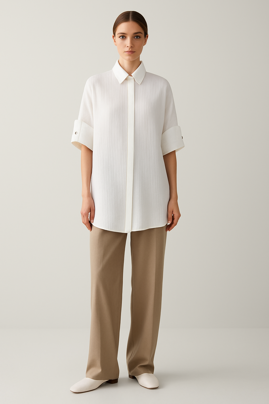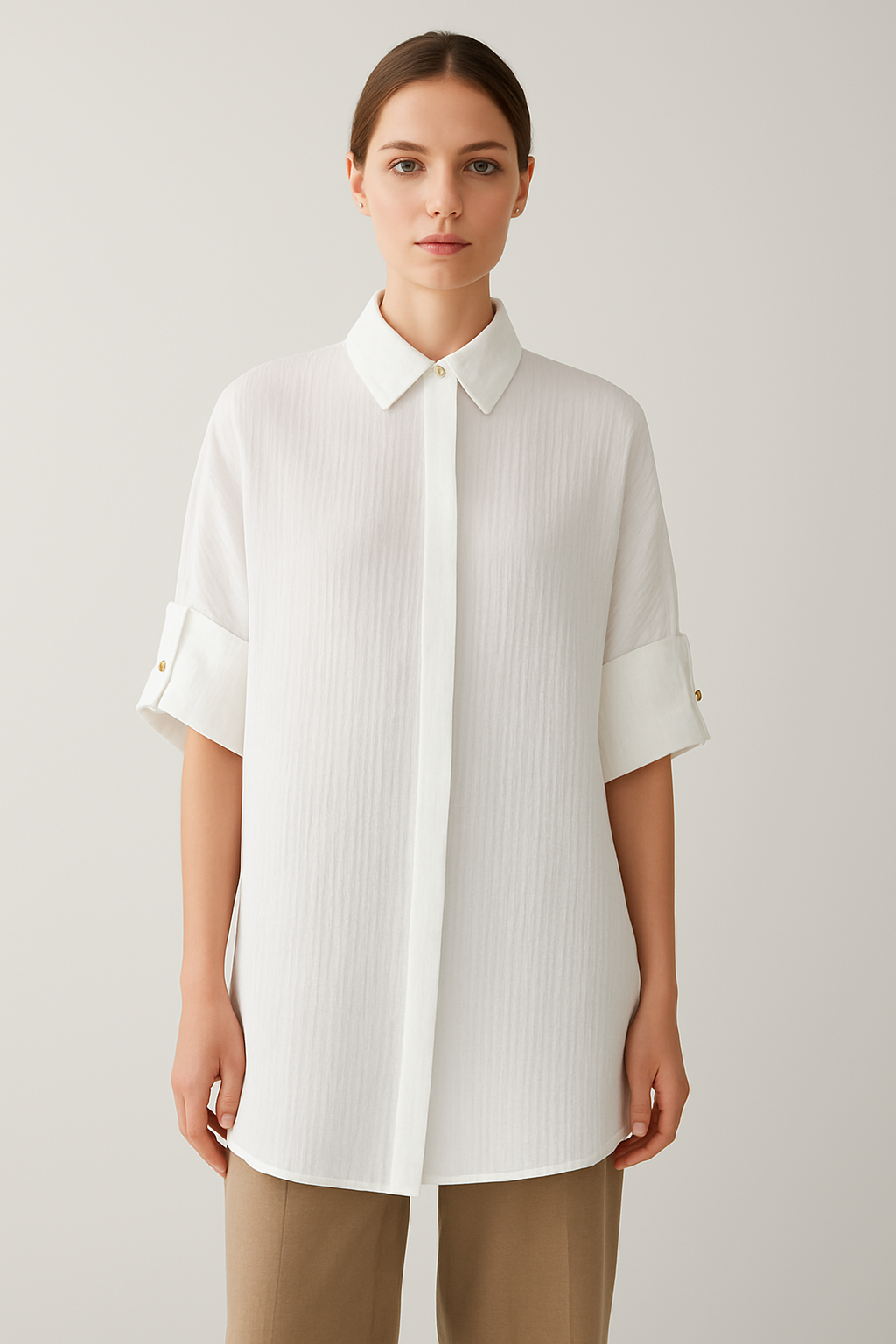 The crinkled fabric adds subtle sophistication, while the pointed collar and rolled-up sleeves balance relaxed comfort with premium style. Perfect for styling with tailored trousers, skirts, or denim, this versatile piece seamlessly transitions from work to weekend.